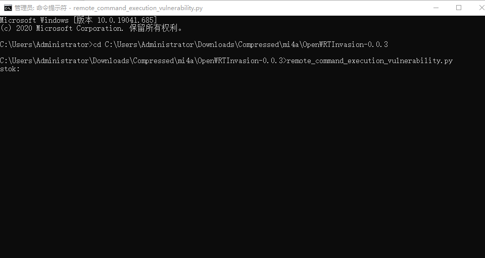 1.进入路由器界面登录获取stok值,然后打开cmd终端cd到OpenWRTInvasion-0.0.3文件夹运行remote_command_execution_vulnerability.py输入stok值【填写等号后面/前面值即可】,如果这一步报错可能是因为没有安装pip3,在终端操作下面命令: