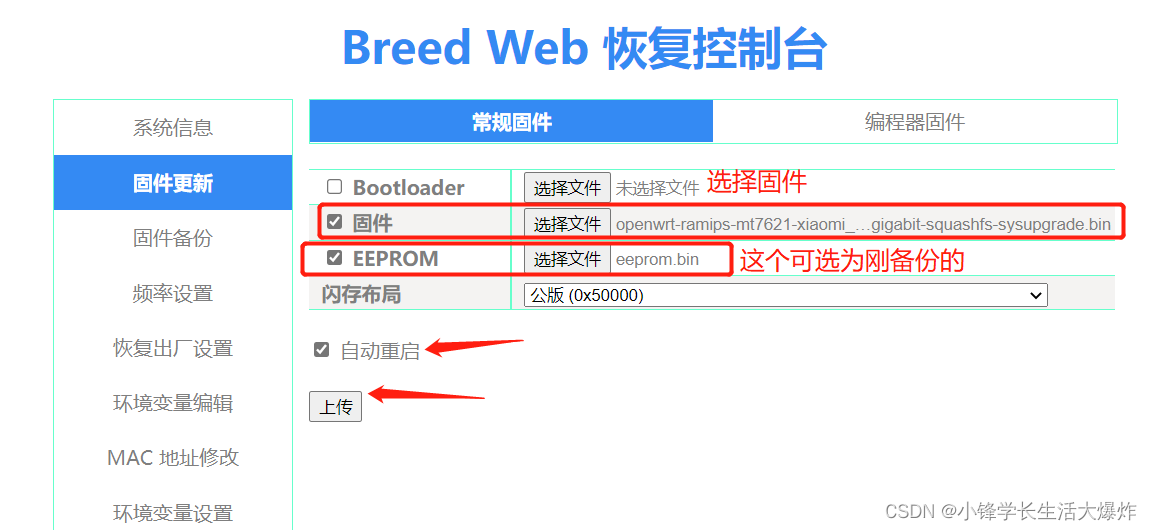注意如果之前没装过openwrt,就先装kernel固件,再装sysupgrade固件(安装方式可参考:小米R3G路由器Breed控制台刷OpenWrt固件)。
